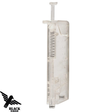 Le BB Speedloader - Limpid de Black Eagle est un dispositif en plastique conçu pour charger rapidement et précisément des billes dans des chargeurs, grenades ou mines airsoft. Il a une capacité d'environ 100 billes et pèse 40 grammes.