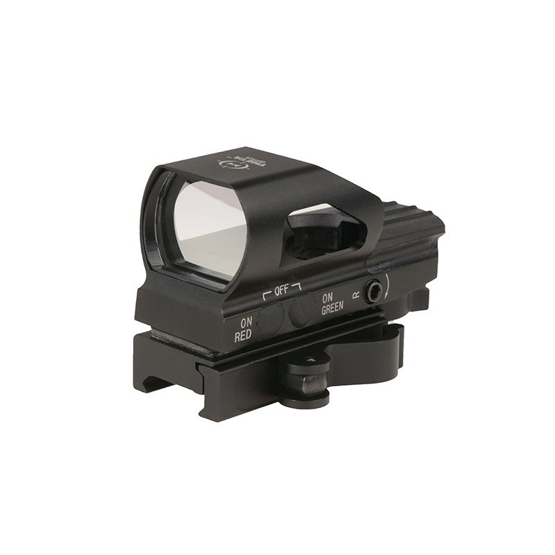 Red dot : de l'anglais signifiant "point rouge" est un système optique avec juste un point rouge pour la visée. A ne pas confondre avec le viseur laser où, là, ce n'est pas une interface en verre illuminée mais bien un "vrai" laser.