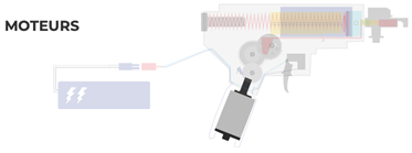 Avant d'entrer dans le détail technique, voici une présentation du mécanisme. Une batterie alimente en énergie un moteur qui entraine un système de trois engrenages. Ceux-ci, par leur action font reculer un piston, qui, une fois libéré, envoie une masse d'air qui permet la propulsion d'une bille.