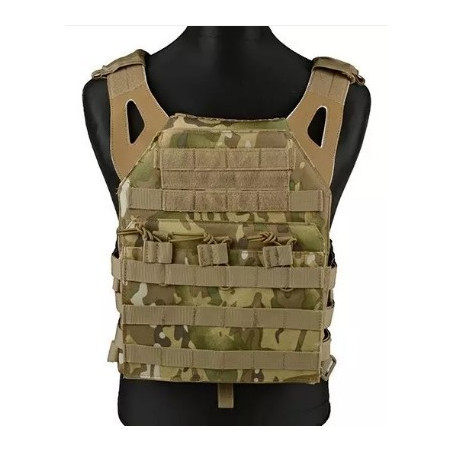 Gilet tactique de type saut Un gilet de type porte-plaques très léger et fonctionnel, fabriqué à partir de nylon résistant. Il est composé de deux panneaux - avant et arrière, qui sont reliés par une ceinture squelettique légère, constituée uniquement de sangles renforcées. Ces sangles peuvent également contenir des accessoires et des pochettes supplémentaires. Le porte-plaque comprend une pochette de munitions universelle intégrée qui contient 3 chargeurs de type M4/M16 ou AK. Les magazines sont sécurisés avec des élastiques avec poignées - une telle conception permet un changement rapide de magazine et maintient également les magazines fermement à l'intérieur de la pochette. Grâce aux copains du système modulaire MOLLE, des pochettes supplémentaires peuvent être installées sur le gilet - sur les panneaux avant et arrière. Le gilet a deux pochettes pour inserts balistiques de taille moyenne. Deux répliques de ces inserts (en mousse épaisse) sont incluses. Sur la poitrine, il y a une poche plate avec des panneaux auto-agrippants cousus - utile pour ajouter des patchs, des badges, etc. Le gilet est entièrement réglable, il peut être réglé pour répondre à tous les besoins et préférences de l'utilisateur. Les accessoires supplémentaires présentés sur les photos ne sont pas inclus dans le kit !