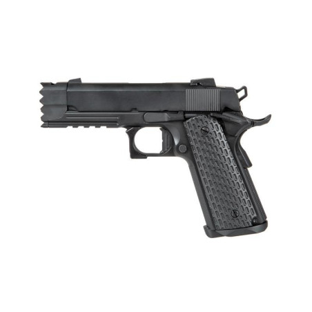 Une réplique de pistolet par Golden Eagle alimenté par Green Gas. La réplique était principalement en métal - des éléments tels que le cadre, la glissière, le canon interne et le chargeur sont en métal. La seule pièce en polymère ici sont les panneaux de la poignée du pistolet - tout comme dans l'original de l'arme à feu réelle.