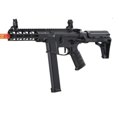 Conception Nylon fibre haute densité, gearbox renforcée, canon de précision, chargeur 120 coups type 9mm compatible G&G, le meilleur rapport qualité prix du marché.