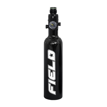Regulateur haute pression (pour la plus part des lanceurs de paintball) et bouteille aux normes Pi pour la pratique du paintball.
